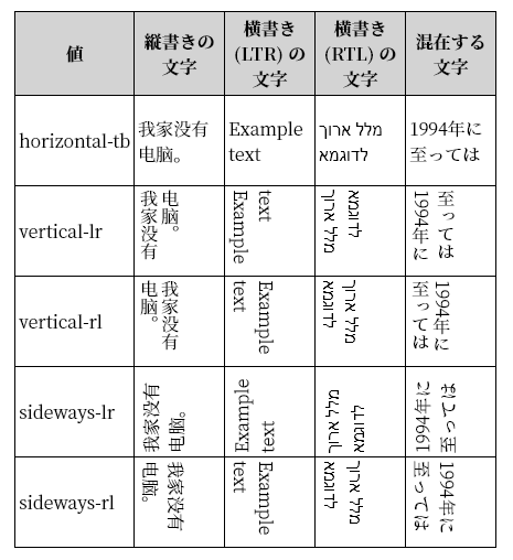 HTML は単純な <table> であり、行方向に書字方向を、列方向にその書字方向を使用してさまざまな種類のテキストが表示される様子を表します。